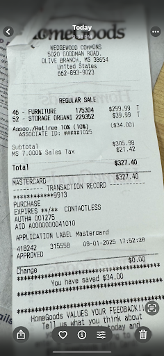 Read moreI am very frustrated and angry with the HomeGoods store at the Olive Branch location. The issue is that I bought a white console $299 and paid for it yesterday. But when I came to pick it up today, the staff had already sold it to someone else. They just said they were sorry and refunded my money, without caring at all about how I felt