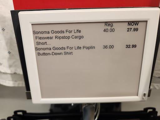 I like Kohl's as a store but today was not the greatest experience. I have two pictures. The price tag that shows $32.99 for Good for Life "poppin" button down shirt, and also a picture of the shirt that says it is Good For Life brand and it is a button down. There were three colors of shirt on the hooks all saying the same thing. This was the ONLY tag around these shirts and shorts on hooks directly below (as the tag also has shorts on it).