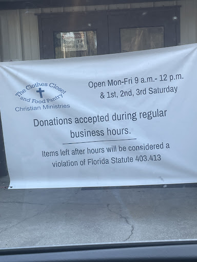 Read moreClothes Closet is a wonderful place and they do wonderful things. Instead of dropping things off at Salvation Army or Goodwill letter to drop it off at Clothes Closet because they help people that are poor and broke and can't get food and clothing and school supplies for your kids and shoes and furniture and dishes they will give you everything that you need to start out. It's run by Orange Park Methodist Church and although I'm not a member there there was a time about 20 years ago when I needed their help when I first moved here and they gave me everything that I said above. And I even delivered the furniture to us like right away they loaded a truck and they followed us to the house brought it in set it up. Living room furniture TV stand dining room table nightstands a desk and A Chair for my daughter just everything it's a wonderful place that's the best place to...