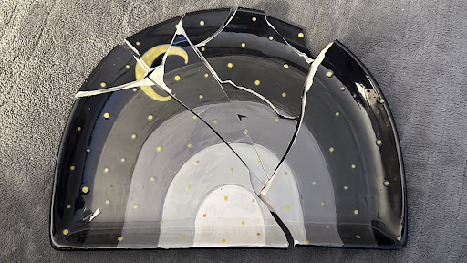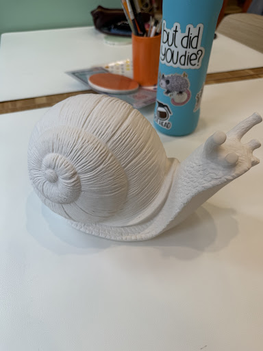 My partner chose the last large snail in the studio (a $45 piece) and put a lot of time and intention into the design, using mixed colors and lace to create layered textures. The piece was more than halfway finished when a staff member accidentally spilled a full tray of paint all over it, and also got paint on my partnerās phone, shoes, and outfit.