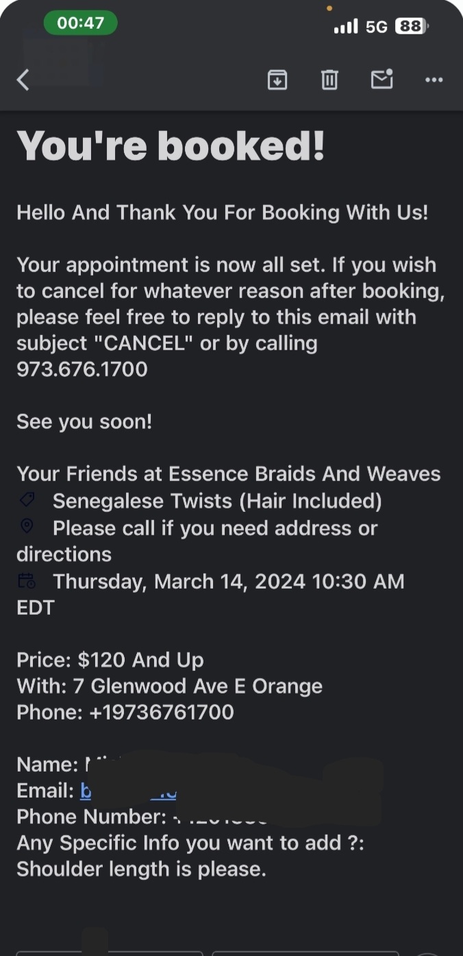 Ā Ā Ā Read moreHad a 9:30 appointment today, got there 10min late. Waited till 10:30 for someone to finally show up and do my hair. So I wanted kinky twist and brought a packs that the lady did not approve of and told me I needed cunban only. So I spoke very calmly to her in a very neutral voice trying to understand the differences in hair because they have the same wavy look, just mine is more shiny and the Cuban she recommended was more rough looking. That lady threw her hands up in the air and walked away from me giving me a nasty attitude when all Iām trying to do is understand the hair differences; I wasnāt arguing with her but I guess asking questions bothered her. This would have been my 2nd time doing kinky twist as the first time was years ago in Harlem as Iām more of a box braid person, so as far as hair buying goes I was not sure and went by what the sales person recommended. I had to speak with another worker who was more patient explaining to me the hair I bought. Anyway I told them Iāll be back in a few min and went to the store on Main Street to have it changed. When I came back a new person was already there working on a customerās hair. So I waited for 10min and had to ask are there more people coming to do braiding. They said no and I would have to wait. Mind you I had an appointment and made a $30 deposit to secure my appointment, though I screwed up with the hair I expected when I came back someone would be available to do my hair, not start with a new customer. Knowing also that I needed to pick up my daughter at 6pm, after waiting at 12pm I had enough. Luckily when I went to exchange hair I asked the sales worker do you have anyone you can recommend for hair braiding, she gave me a card, I called and as soon as I walked in my hair is started. No appointment no wait. Also I should mention that when I showed the new salon the pic of the kinky twist and how my hair looked she said I should not have gotten Cuban and showed me the pack I should have bought, which I told her I bought that pack initially but essence did not want to use that packš While the gentleman on the phone was polite essence hair braiding is horrible at customer service, donāt know how to communicate with customers and do not keep appointment times. This is my first time getting my hair braided in NJ and Iāve lived here for 4 years now, Iāve traveled so far as to go Harlem, but because of my toddler I cannot any longer. I thought essence would be the place but Iām highly disappointed by their lack of professionalism and service. I am happy I found somewhere else close by at the last min, now Iām just awaiting my $30 refund, letās see...