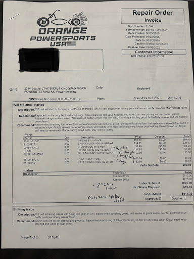 I recently had my 4wheeler repaired at Orange Powersports. When I brought my 4wheeler in I gave them a list of things that had recently been repaired on the 4wheeler so they would know those were not things needing attention. The service department called and requested a second hour of diagnostics which I agreed to. When they came back with the estimate they had items listed of a part that is very expensive that needed to be replaced that I had already told had already recently been replaced. It appeared they had not even listened to that conversation when I brought the 4wheeler in. That was the first red flag. They had also added an oil change which I told them I had already recently done. They said they would take those 2 items off and get me another estimate. The 2nd estimate came back $1000 less! This was my 2nd red flag. They were approximately charging me 4 hours to do the oil change and the fuel pump assembly repair. I knew that this could not take this long since I had recently changed the fuel pump without a lift and all their tools in only 30 minutes. I know there are cleaning and doing other things but there is no way it would take a true atv mechanic that long to do theses 2 ārepairs.ā When they finally called to let me know the repairs were done, they told me the battery was bad and it would be an extra $300 to replace it for the battery and the labor. I KNEW the battery was good so I told them no thanks I had an extra battery at our house. Alone to install the battery was $140 and that would be for 5 minutes that it takes to install the battery. This is absurd! I argued the total repair and labor costs but nothing was changed. I paid and told the service guy there that I wanted a manager to call me. The manager didnāt call me until I reached out to Orange Powersports again. We talked on the phone about all the issues. He said it would take 4 hours to do the fuel pump assembly and the oil change. I was charged 8 1/2 hours for the others repairs done to my 4wheeler. I told him that couldnāt have taken that long. He said the Mechanic actually took 10 hours but they only charged me 8 1/2. What a lie! I then addressed the battery issue. He couldnāt justify the charges for the battery. I told him that I took the battery to Autozone and it checked good. The service department told me that they had to jump start it every time while they had it. I had never had to do this at home and I havenāt had to afterwards either! It starts on the 1st try every time! (When I picked it up the guy said he would go jump start it real quick so I could ride it around the neighborhood before I took it home. I doubt he really had to do that. He just needed to cover his lie!). You may think I just donāt know how long all of these repairs really take. I knew many would think that. So I contacted another local atv repair place. Without disclosing all the issues, I simply asked them how much for the parts and labor to do ALL the needed repairs, including an oil change and a fuel pump assembly. Guess what? They would charge me $1759. This is about $750 less than Orange Powersports. This 2nd location is just as big and skilled too. Itās not a home mechanic or anything like that. So, in conclusion, Orange Powersports is a very dishonest repair shop. The labor per hour at both locations was the same. Orange Powersports just added labor hours that wouldnāt be needed so I would have to pay more. The manger said he would have no reason to lie to me about this when I talked with him. I can think of about $750 reasons right here! Duh. Obviously the parts would be basically the same too. I asked the manager for some amount of refund but he said no to any refund. Honesty is hard to find so I hope all who read this will do their own homework and know that Iām not doing this vendictively. I expect companies to be honest and when theyāre not, people should...