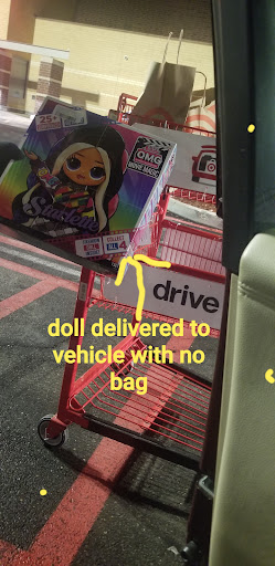 Next day...I decided to purchase another LOL doll my daughter really liked and the only Target store which had it in stock was this Orange CT Target. So I said, there was no way they could screw up Drive Up pickup...and when I arrived to the parking space, I lifted my trunk so the staff could put it in the back of my SUV. Simple right? NOT for this store. The staff passes the open trunk and brings the darn doll to my drivers seat window with the ..... doll in NO BAG AT ALL. My daughter says from the backseat..."okay...I'm gonna just pretend I didn't see that one too!" I was HORRIFIED AND MADE HIM HOLD IT SO I COULD TAKE PICTURES. Mind you that the other packages are in a bag and some folded down. I just couldn't understand it.