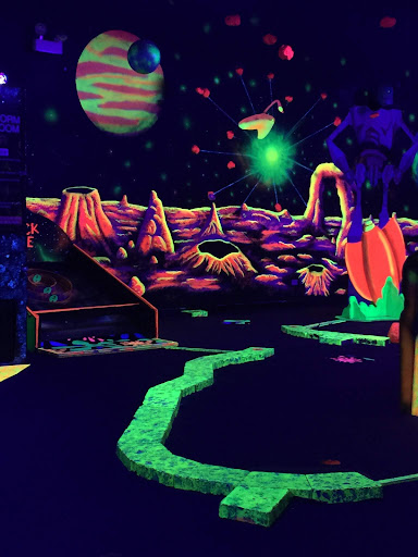 Read moreThe concept of space golf is great. The idea of reservations is great. Arriving 15 minutes before your reservation is a common courtesy and is expected, BUT this should mean the people entering at their proper reservation time should have at least a 15 minute "jump" on playing. We arrived 15 minutes before our reservation time. It took about 10 minutes to pay and then receive our putter and pick our ball. We had 2 adults and a 9 year old child. So choosing a color took an extra minute. We entered the space golf area, where there is a sign stating "put 3D glasses on now"... hold up, game changer... glasses? 3D? We didn't even see it advertised. So puzzled, we inquired. It was an extra $1 per person for glasses. So we paid for that. Also took a few minutes. Once all organized and inside we proceeded to play. By the time we reached hole #3 we had people behind us waiting on us to finish so they could play. That made us feel rushed and anxious so we tried to hurry up a bit, which took the fun out of it for us. Especially if you were trying to have a fun little competition. We eventually finished all 18 holes... with 2 total different parties waiting on us to finish. *If they can organize their time slots and maintain that 15 minutes in between allowing customers, that would be another star given. * They have a food kiosk and an arcade area as well. Also sell some t shirts and other novelties. Another star not given... they encourage photos without flash, but I didn't want to feel as if I was not being courteous of those waiting behind us. It was our first time going and I wanted to take pictures.