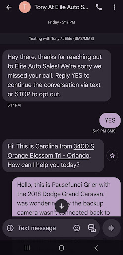 My Husband and I purchased a 2018 Dodge Grand Caravan from Elite Auto Sales on 7.19.2025. Due to technical issues with the DMV website, we couldn't bring the van home that day. We were promised a new touch screen audio system (that they paid for), that wouldn't be delivered for a few days. It was supposed to arrive on 7.23.2025 but it didn't come until 7.24.2025, we picked the vehicle up on that day. When I backed the van up to leave, I noticed that the backup camera didn't show up on the screen like it did with the old one. I thought that since it was a new screen, there was a setting I needed to change. We had driven an hour and half to get the van so we went home and I tinkered with the settings later. I texted Carolina, the Owner, on 7.25.2025. I expressed my disappointment and she seemed to be concerned. The last communication I had with her was on 7.29.2025. Today is 8.1.2025 and I'm no longer waiting to do my review. IF they do right by me, I will give an update. They bought a brand new touch screen for the van, THAT DOESN'T CONNECT TO THE BACK UP CAMERA! My Husband spent over $11,000 cash for this van for me and now I'm embarrassed that I even did business with them. This should have been a good experience, they were kind and seemed understanding in the beginning. We'll see how they react when they see...