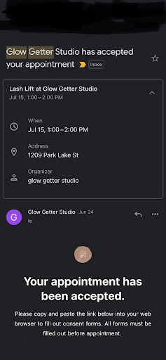 My appointment was made on June 24th for a lash lift on July 15th with Stephanie. I received an email that confirmed that my appointment was accepted by the studio. I then got an email on July 12th that my appointment was cancelled and just one short explanation of “not accepting new clients”. This is not mentioned anywhere on the site or Instagram, and they didn’t even have the decency to call. They have a strict cancellation policy but have no issues canceling on their customers as they see fit. I now am left days before an event without my lashes done and no time to find someone else since this studio acted so unprofessionally.