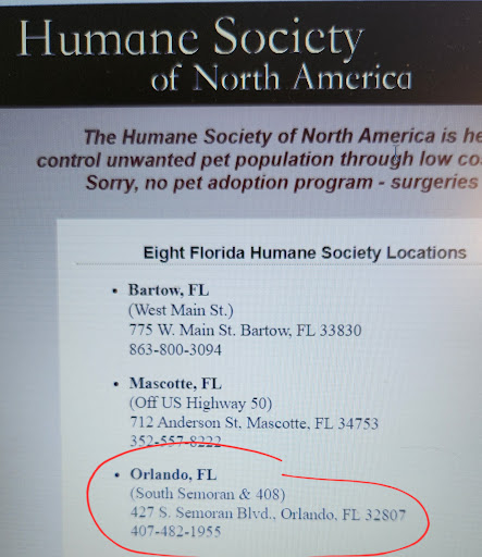 Read moreWent to their website hsna.org and called this exact location. The same number listed here on google is listed on website. The phone takes you to some 408 pet hospital instead. They say they are at the same location as the Humane Society, but have different pricing than what's listed on the Humane Society website. I ask to talk to the humane society. They give me a phone number for Pet Alliance (I called, and no, they are not affiliated with the Humane Society). So, I called the 407-482-1955 number back to let them know the phone they gave me was incorrect and how do I get in touch with the humane society? Girl kept repeating herself saying 'we do surgeries for the humane society' as if that answers how do I talk to them and schedule a surgery with their pricing? Kept giving me Pet Alliance phone number. Don't even both trying to get in touch with these people. Waste of time. And the 408 clinic was RUDE. I would never trust my pets anywhere associated with...