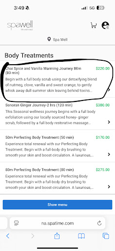 Read moreThe massage we received was wonderful and the therapists are great - however the spa (as you can see in other reviews) likes to introduce all these hidden charges at the end. When we checked in we were offered 20% coupons each towards a spa service (no real exclusions listed) so we go online and book two 80 minute salt scrubs planning to use our coupons - they were priced $220 as you will see in the photo attached. Nowhere did they specify (as you can see) this is a special price it was just listed as $220 - well massage is over we’re all relaxed we go to check out and present our coupons and we are hit with the “oh we can’t apply those this is already a special price” where is that listed…? It just “is”. Okay whatever. Well then we had to automatically tip 20% on the ACTUAL price (another hidden one) of $270 each!!