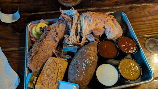 We went for some BBQ last week. I got the "flatbed meal" (1/3 pound portion of turkey, brisket, and pulled pork + 2 sides) and my Fiance got a 3/4 pound brisket meal. Unfortunately, this was some very lackluster barbecue food, especially for the price. All of the meats on my plate were very dry and about the same temperature leading me to believe that they were microwaved. While it is minor, my cornbread was so dry that when I went to take a bite out of it it basically exploded into crumbs and made a mess all over my shorts and the table. The brisket did not have any kind of smoke ring in it and was all a dull brown color while being the consistency of overcooked pastrami. It also was extremely dry and required a lot of barbecue sauce. The turkey I received was very flavorful but had the texture of Thanksgiving leftovers. The beans I got with my order were cold in the middle and warm on the edges, a sign of something being microwaved.