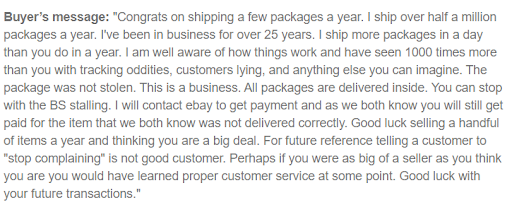 Now the reason I'm here. Nate claims he never received a package I shipped to him. Tracking tells a different story. Nate says he knows how this works, yet he's never heard that on ebay, if tracking indicates delivery, it is out of the seller's hands. Funny, I've known that for 20 years. He huffed and he puffed, hoping to bully me into giving him a refund. When that didn't work, he contacted ebay directly, where he was told to kick rocks.
