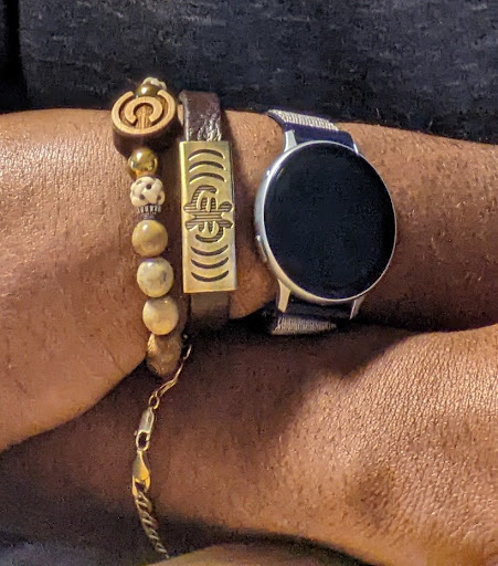Below in the picture, the middle bracelet is one I purchased from Luvlee Treasures. I was initially attracted by the design but was more impressed by the quality. The brushed metal design does not irritate my skin and the leather band is strong and durable. The clasp is also different, it's not pictured, but it's pretty cool and I have no problem with it coming loose.