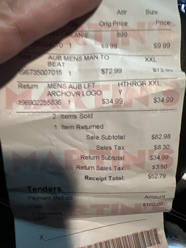 Read moreI think they need to close Martin's down they don't have hardly nothing I didn't save it for people in there working in the whole store one lady at one register is all I seen down at Oxford and the one in Anniston is not much better went in there looking for some tennis shoes they have plenty of women's tennis shoes but I don't have much for women I guess it's when all to a women's store I don't know but I won't never go back to Martin's I hadn't been there in probably I used to have a Martin's credit card and I shredded it years ago but I won't never go back there I don't have nothing I need I order offline anyway but I think they ought to close all the martins down but that's just one opinion have a good day may the Lord take a...