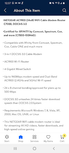 Read moreMy husband and I signed up with this ISP in June of 2020. They only offer 1000Mbps or 105Mbps, so we signed up for the 1000Mbps speed. We were told we could either use a 3.0 or a 3.1 DOCSIS modem. We did not want to rent one from them, so we bought a 3.0 modem rated for 960Mbps from Wal-Mart. My husband works from home, so he tests our speed nearly every day. He consistently gets speeds above 900Mbps. Except, as of today, they have reduced our internet speed to the 105Mbps for the second time without notice or our agreement. My husband talked to a supervisor today. She claims that our modem is only compatible up to 100Mbps according to her tech people, so they arbitrarily decided we can only have the lower speed internet. We paid a lot of money for the modem we have based on what they told us in June. Now they want us to pay more money for a 3.1 modem. (Or possibly, they are trying to get us to rent one from them?) We have been paying for high speed internet, but they want us to be low speed internet customers? We want to pay more money for the higher speed, but they want less money? On the higher speed, we don't have any issues. But when they lower our speed to 105Mbps, our internet is too slow for my family. The supervisor my husband talked to today, refused to listen. She insisted he was wrong, and kept saying "no" over and over. Please see the picture of the Specs for the modem we bought. It is a screenshot from the Wal-Mart website. Netgear model number: C7000v2