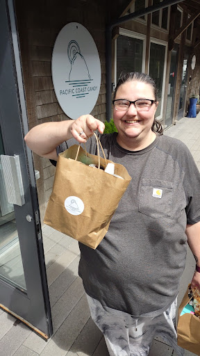 Did our 1rst post-Covid drive down to the coast, after getting our Shots, spoiled ourselves by stopping in Pacific City and made a leisurely stop at the new Candy Store in the Village Shop area. The first thing I notice is the wonderful color scheme, the tealish/seafoam color was wonderful and inviting, not to mention the smell of freshly made waffle cones. There were great retro candy's striking a warm fun area of our childhoods and young teen years, along with lots of choices of salt water taffy options (John and Leslie, the owners, even invite you to sample if you are curious about a flavor) and super delicious Chocolates in the chocolate case (I understand both are made in Oregon), not to mention made daily Waffle cones with Tillamook Ice Cream, which we enjoyed out on the picnic tables.