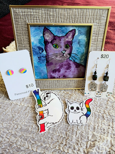 From intricate jewelry and hand-painted silk scarves to crocheted hats, gloves, and scarves, there's a beautiful, eclectic range of goods to browse. The fused glass sculptures and decorative items caught my eye immediately—each piece is so thoughtfully crafted and truly one-of-a-kind. If you're into fine art, you're in for a treat as well. The shop showcases stunning linoleum block prints, mixed media works, watercolor pieces, and even custom pet portraits. You can also grab reproduction prints and stickers of their original artwork, which are perfect for bringing a bit of their creativity home with you.