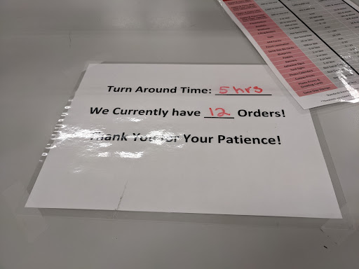 Reflective of the signage on the counter as you approach the printing service desk that notifies you immediately before even asking that they are "12 orders ahead of you and 5 hours delayed" ...before you even ask and on opening the store location at 9am....Lol You got me on that one!