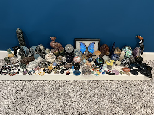 Within my pic you’ll see a variety of items I’ve purchased from towers, spheres, palms, worry stones, discs/cookies, donuts, free forms, flames, specimens, carvings, fossils/shells, tumbled stones, pebble stones, sun catchers, butterflies, glass items, resin items, rings, pendants, bracelets, fun trinkets (bird whistle). So many other items not pictured but it’s one of my fav stores to shop. The UV selection is also the best I’ve seen.