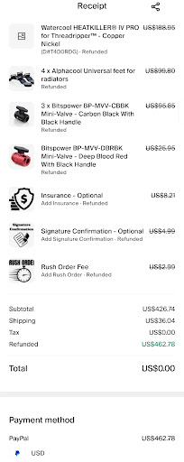 Photos attached: screenshots showing the refunded order (US$462.78) and the zeroed out order summary. Also attached is a photo of the large shipment of water-cooling parts I received from TitanRig, Newegg, and Amazon, vendors that delivered without issue. The only missing items are the ones Performance-PCs failed to supply, which now delay my entire build.