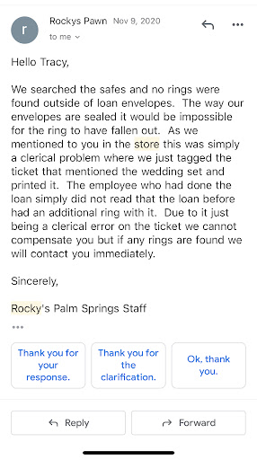 Well, here I go again, I had to go see my friends at my friendly neighborhood Pawn Brokerage to See Dan again as we all know it's almost Christmas and times are not only tight but tough as well, I'm happy to know that I can count on my friends at Rocky's to help me and not overcharge me on the service charge, like other places have in the past and I would feel a miss if I didn't tell anybody and everybody in town if you need help and you have some quality merchandise that you don't want to sell but you really need a few bucks to get you by till payday, or maybe you haven't bought that special someone in your life something special this holiday season and Rocky's has an amazing line of Jewelry and all other types of merchandise and tools at a reasonable price. So if you're running out of money and time, do what I did and go see your friends at Rocky's Pawn Brokerage in beautiful downtown Palm Springs. You won't be sorry,(or in the doghouse) Merry Christmas Everyone Reverend Matthew...