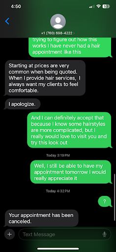 After that, I had to text Selma three times just to get a responseāand when she finally replied, it was only to say that my appointment was canceled. Instead of discussing the price or answering my question, she assumed I wouldnāt want to pay more than $100 and canceled based on that alone. I never said I wasnāt willing to pay moreāI just wanted to understand the cost.