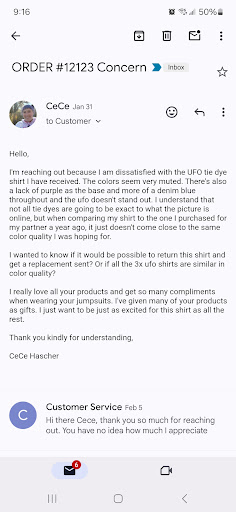 I used to love the tie dye queen! I have been a customer for over 5 orders since 2020 and never had any issues. Even had a hole in the armpit of a shirt I received once and had a prompt reship. Customer service used to be spot on. My purchase from January 2024 of the Alien UFO shirt was of muted vibrancy in the color quality. I know this because I had purchased my partner the same one a year prior and it was phenomenal. The dye didn't take well and after reaching out she promised she would make it right and send a new shirt. I've been contacting her for 4 months. Customer service had finally reached back to me in March saying they would get it out in a week and to reach back out if I hadn't heard anything. 2 months later and several emails sent to them has left me with no choice, but to give them this rating. Wish they could make it right, but looks like they make enough money on everyone else than to care about fulfilling their intention of a reship of an original customer. I've promoted the shop everytime I get compliments on her tie dyes, but I...
