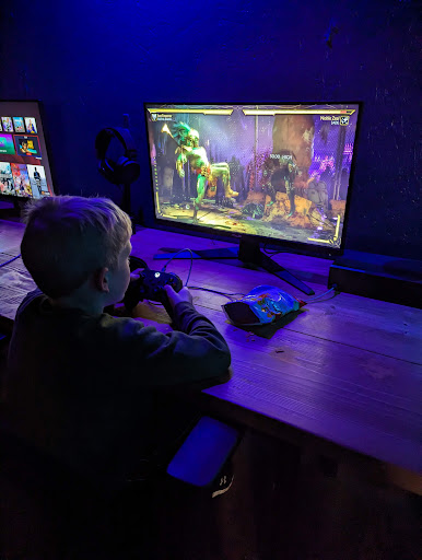 What, in my opinion makes The Nerd Place special however are the 2 gaming areas. The most apparent is a 4 station console gaming area in the main shop area that features comfy lounge style seating and 4 large flat panels for game play. The other is the backroom, which has 4 console stations aligned together desktop style plus an array of 15 independent, and colorful PC gaming stations each with headsets with mics and a large comfortable gaming style chair. The ambiance is conducive to game play - low and colorful blue and teal lights overhead.