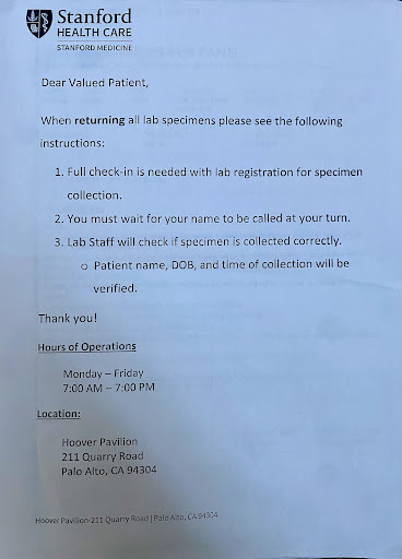Read moreI was neither given a written nor a verbal estimate. Stanford charged my insurance $4,476.00 and my patient responsibility was $1,563.78.All of these exact same included services are a standing order that never cost me over $20 at Quest last year. I did these labs many times last year and I have a standing order.These charges should...