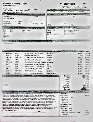 Decided that since I do not live locally, and going home in a few weeks, that the timing was not proper. Cancelled audio side same day and LM Sunday, Nov 11, 2024, when they were closed, asking to stop the order and refund my monies. LM multiple messages with only 1 call back and no VM. Struggle on my end was because of work and the times shop was open. Today, Nov 21, I am off and got in touch with merchant, who proceeds to tell me, "not refunding you because those were special order items". Please help me understand WHERE this receipt states these were special order parts? Where does it state the deposit was for the purchase of items? Definitely not itemized as to what my $700 is buying.