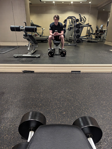 The thing to note here is that the gym portion is very small and somewhat disappointing for how big of a hotel it is. There are dumbbells which go up in five pound increments up to 75, and then the long dumbbells which are fixed weight barbells that go up to 110 lbs. There are two bench's, which are adjustable from flat to 90 degrees, and a few soft mats to do assorted plyometrics on.