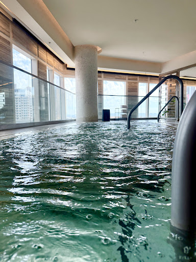 The vitality pool was cool in theory but weak in execution. The "bed" structures inside the pool are too deep and super awkward to lay in because you just end up floating slightly above them. No benches either so you just kind of sit perched on the structures? Pleasant temperature but very awkward to exist in.