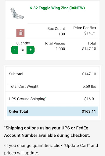 Their is a reason I stopped coming here...If you do not do your research they will take advantage of you 10 fold. I came in for 6/32 toggle wing....and wing only. Gentleman made up a price of .75 per wing. Home depot sells toggle and wing at .65 with bolt. I explained to him Zal industrial has name brand wings powers DeWalt @ .17 cents per wing....brown bag bolts in paramount... @ 11 cents a wing....and the dude proceeded to tell me...we sell them for .75 cents. Dude rather lose business and cost owners then to do some research and give a fair price...I wonder how much business they have lost over made up numbers and lack of research. Imagine if I would have agreed...a bill of $750.00 vs $163.00...
