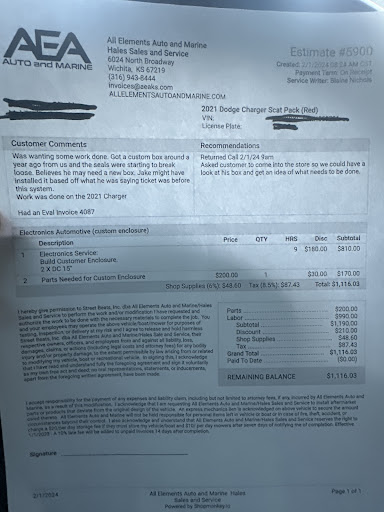 So I dealt with this company and they installed audio in a few car of mine. Roughly about a 1 1/2 ago I had them built me a custom speaker box for my DC 15 that I was putting into my 21 dodge charger which they charge me a little over $500 to build. About a month ago my speaker box started to lose it seal and coming apart and now sounding terrible . So today I went to their shop to see what can be done. First thing the manager tried to tell me was this work was done over 3yrs ago and I said no I haven’t even had this car 3yrs ago , it’s a 21 and I didn’t even buy this car until march off 22. I said maybe you’re getting this car confused with my other charger I had him build a box for. Then he tried to tell me that this wasn’t even the car they built this box for that it was another car and again I said no it was this car that he built this box for and installed. At this point I’m getting kinda irritated cause I can see where this is going. So he proceed to tell me it’s been over a year that they don’t give warranties beyond that for boxes and that I need a new box built. I’m like fine give me an estimate on a new one built.$1,116.03 is the cost he gave me. That’s over double then what I paid for the box they built for me before. He say it’s different material they use now to build the boxes now and that why the cost is different. So I look and the paperwork he gives me and really feel like this guy was trying to hustle me. Jake is a great guy and installer but their manager thumbs down . $200 in parts and...