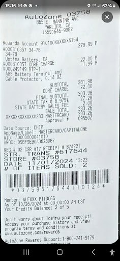 When they had initially installed the new battery they had cracked it( w/o my knowledge) causing my car to shut off on the freeway. I never received a receipt in person or through an email. Iâve gone to mechanics and theyâve all said everything was fine, cut to today August 27th the battery is completely inoperable land the crack was noticed by an employee at a different Autozone in Santa Ana. When I called the original store they said they couldnât do anything to help and I was pretty much SOL. Iâve been told a receipt can be tracked as by other employees but when I mentioned it to the female I was speaking with she simply hung up the call. Not the best experience and I hope this doesnât happen to anyone else, switch your own batteries even if you need to watch tutorials on...