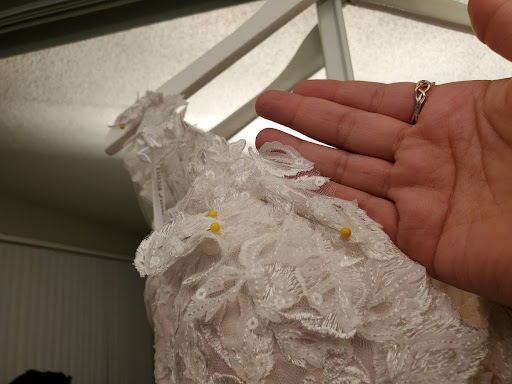 When I picked up my dress and top, the top was not attached to my dress, the lace patterns on my top were misshaped, a button was missing from one of the sleeves, my built-in bra was missing, and the two pins that were on the sides of the dress were just taken out. The sides of my dress were never even altered! Only the bottom of my dress and bustle was completed even though the “alteration package” was supposed to include, “everything”. With hours away from my wedding, it was too late to make any more alterations and there were still corrections that needed to be done.