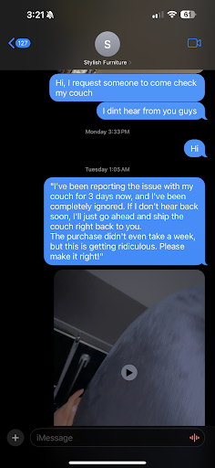 When I finally reached someone, they promised to send a technician to inspect the couch and, if needed, repair or replace it. However, when the delivery team arrived, they didn't address my concerns. After showing them the issues, they simply reported back to their boss, who told them to leave without taking any action. My attempts to contact the owner after this went unanswered.