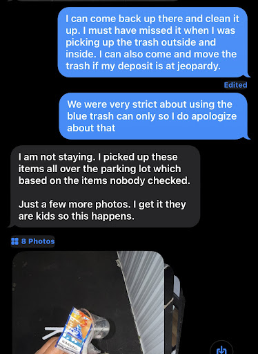I attached pictures the owner sent to me of the minimum trash in which they supposedly hired a crew to clean up as well :-/