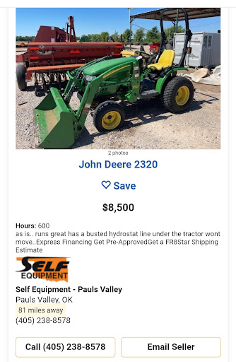 Read moreI purchased a John Deere 2021 5090R from Self Equipment. And I have to say it was a seamless experience from beginning to end. Both Josh and Jeremiah were extremely helpful, honest, and upfront about everything. It was a bit of a hassle on my end and some things got messed up from my credit union and getting the funds to them. And both Jeremiah and Josh were extremely patient and understanding at every step of the way. They answered any question I had in a very timely and quick manner. They even sent me multiple videos anytime I asked to see the tractor and go over the details of the tractor.