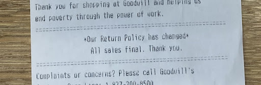 So, I was a huge fan of Goodwill! I found many good treasures here, and most of my clothes come from Goodwill. Me and my family are huge thrift store shoppers! However, since the pandemic, Goodwill has gotten rid of many of the things that make shopping at Goodwill fun, and because of that, me and my family have been shopping at other thrift stores more and more. The latest thing is that they have removed their dressing rooms! I went to talk to a lady, and she said that because of shoplifting, the pandemic, and many other things, every location will be getting rid of their dressing rooms. “This seems foolish,” I explained to the lady, “how am I supposed to know whether or not what I am buying fits?“ She told me about their seven day refund policy at any location. I have a big family! There are six members in my family and we are really busy, you mean to tell me that I am supposed to take time out of my day to go to a Goodwill after I have tried on all of my stuff at my house, and return it!?! If the refund policy where a month, it might be worth it, but a week is not long enough. I’m sorry Goodwill, I think me and my family will be...