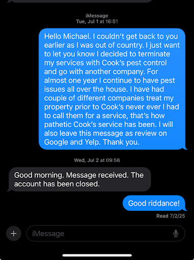 Read moreI wanted so bad to like cooks pest control because our technician is so nice! BUT we still have had huge issues with bugs! After a few months I called and let them know we still have issues (they agreed that a tech needed to come out ASAP and fix this issue) well no one called.. I had to call back a few days later and they finally had the tech come out the following day. They then proceeded to CHARGE me for the extra visit! So over all I am not satisfied with my experience. I still have plenty of bugs and a...