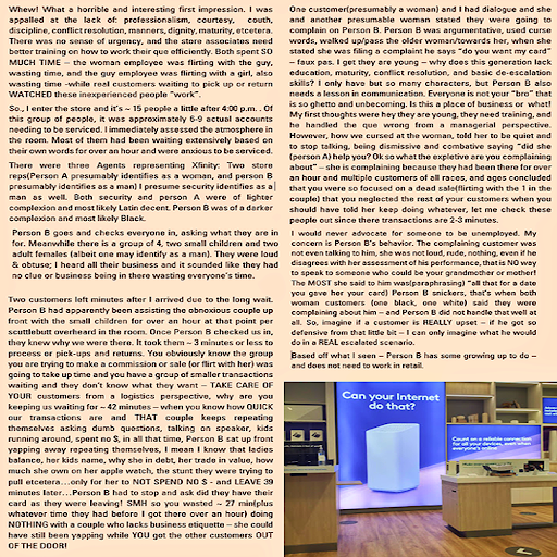 Two customers left minutes after I arrived due to the long wait. Person B had apparently been assisting the obnoxious couple up front with the small children for over an hour at that point per scuttlebutt overheard in the room. Once Person B checked us in, they knew why we were there. It took them 3 minutes or less to process or pick-ups and returns. You obviously know the group you are trying to make a commission or sale (or flirt with her) was going to take up time and you have a group of smaller transactions waiting and they donât know what they want â TAKE CARE OF YOUR customers from a logistics perspective, why are you keeping us waiting for 42 minutes â when you know how QUICK our transactions are and THAT couple keeps repeating themselves asking dumb questions, talking on speaker, kids running around, spent no $, in all that time, Person B sat up front yapping away repeating themselves, I mean I know that ladies balance, her kids name, why she in debt, her trade in value, how much she own on her apple watch, the stunt they were trying to pull etceteraâŠonly for her to NOT SPEND NO $ - and LEAVE 39 minutes laterâŠPerson B had to stop and ask did they have their card as they were leaving! SMH so you wasted ~ 27 min(plus whatever time they had before I got there over an hour) doing NOTHING with a couple who lacks business etiquette â she could have still been yapping while YOU got the other customers OUT OF THE DOOR!