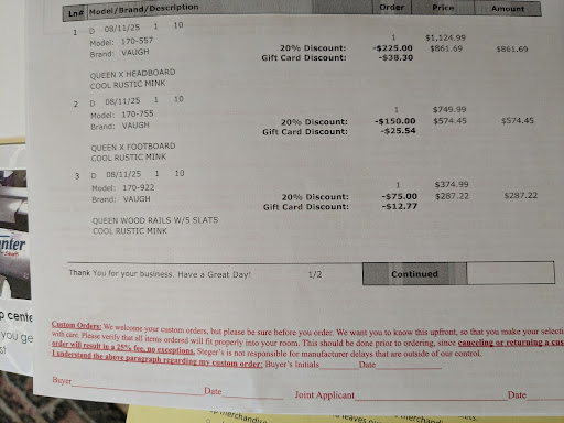 We purchased a higher-end bedframe along with delivery and setup. On our invoice, we were charged over $200 for the wooden slats that are supposed to come with the bed. The invoice also listed three metal supports at no cost, which Bryan Steger (a head of the family business) explained were “a gift” they include with all bedframes because slats are supposedly weak.