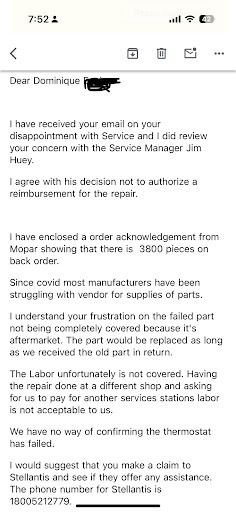 Read moreWell, Joe, you wanted me to review. Here's your review. I brought my vehicle in for service in February (front end vibration and metallic scraping sound when going over bumps). After being told that I was HEARING the harmonics of the engine and the technicians could not replicate the vibration issue, I went to the dealership to show the technician the issue. Then, the technician proceeded to tell me that it was because I purchased a four cylinder, it was because of the pitch of the engine and my engine mounts could be replaced. Joe, the general manager, reached out to me due to a "1 star review" that was not showing up in my history and asked me to give them another shot. He was going to get me a loaner vehicle and figure out this issue. I brought my vehicle to the dealership again on a date that Joe and I agreed on. Upon arrival, Joe did not recall who I was. He had no vehicle ready due to the snowstorm and all of his vehicles being loaned out. No courtesy for a phone call to let me know though. However, I ended up with a vehicle from the sales lot. After having to run back and forth from the front of the building to the service department to unlock and unload my car to get home and not one offer of anyone to help or even take the keys at least, I ended up getting a call the following day around 230 that they were going to start looking at my car and expected to give me an answer by close. Around 5pm, I received a call from the dealership saying that there is nothing wrong with the car (again) but the technician has a similar problem and simply puts his vehicle in neutral!? However, they were having my vehicle detailed. I went the next day to pick up my vehicle and I couldn't have been pushed out of there fast enough. No explanation, no allowance for questions. When I got in my car, there were no courtesy mats, and it was clear it had not been detailed. I sent an email to Joe asking if it was detailed. He said it should have been vacuumed and windows cleaned. I showed him the picture (attached) I took when I picked up the car. And I haven't heard from him yet. I contacted Dodge because I refuse to believe that putting my brand new car in neutral or having the motor mounts replaced are acceptable. Oh, and when they "detail" a vehicle it means they don't...