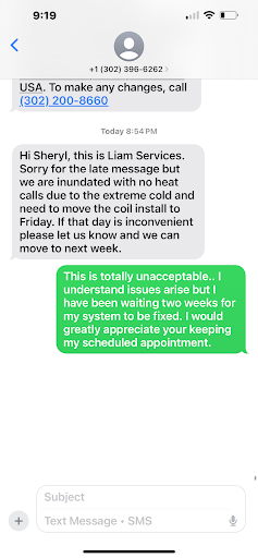 Tim for HVAC came out today. Again, Tim is professional, very nice, and knows his job. Those 21 years of experience show! Our home is a rehabbed house and a lot of things were done improperly. Tim repaired an air duct to the family room. Taking it a step above, he also redid the step that the air duct was hidden behind, AND better than the original! All this done in about an hour. I am so please with LIAM Services and I love all the guys that came out. They treated my home as if it was theirs, even cleaning up behind themselves. I have definitely found my forever service team!! 💜. P.S. the ladies in the office are wonderful too! (Jenna...