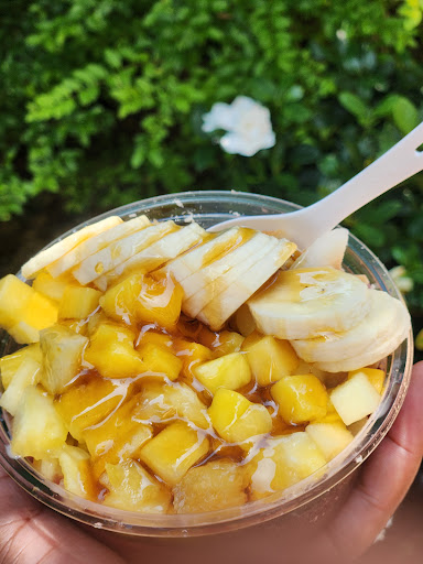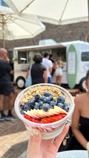 I am addicted to matcha tea šµ I drink it daily. I saw a review of Bear Fruit Bowls and they mentioned how delicious their matcha is so I decided to try them out, especially because I had never had a fruit bowl before either. Talk about a cute little spot, a shady tree filled courtyard with a cute converted bus serving different size fruit bowls with fresh toppings and coffee and tea. I decided on a bowl with acai, almond butter, strawberries, blueberries, bananas, mangos and granola with a honey drizzle. I usually only drink my matcha tea hot but I decided to try an iced matcha latte with whole milk instead. It was love at first bite with the fruit bowl, the acai consistency reminded me of sherbert, a little tart and extremely delicious. Combined with the almond butter, fruits and honey, I now have a new obsession! The iced matcha latte was creamy and also delicious, I'm soo glad I decided to try it a different way. I'm soo happy to have a new (to me) delicious way to eat fruit and I am really looking forward to trying a different combination! I went back recently and had a mixture of acai and blue spirulina. It's definitely my new favorite...