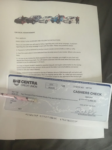 My fiance and I were trying to sell a spare grill we have on craigslist. He received an email right away from a random person who said I'll give you $50 more than to take ad off and I'll send you a cashier's check. Once you received the check take it to your bank to clear it then I'll send my movers over to collect it. We received the check for 3500 and was like this is bonkers. I called the actual credit union and they said yeah that's not ours and contact your local police department. Funny thing is that the maker is an actual restaurant in Texas where the check was drawn from. It looks like a paycheck that was typewritten cashier's check on it with a...