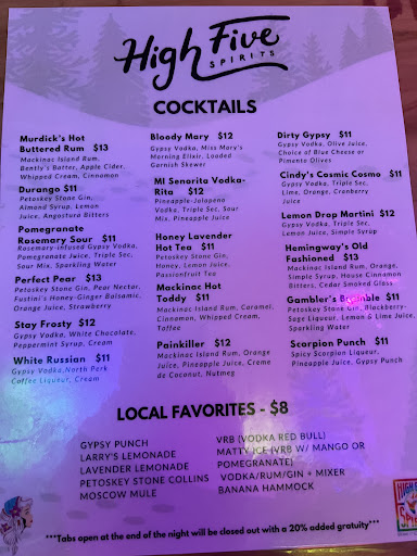 Read moreMy husband and I went to High Five Spirits for the first time on Friday night. Weâve walked past it a few times when we visit Petoskey and always wanted to stop in. Itâs very cool in there with lots to look at if you donât want to talk to the person youâre with haha. The drinks were delicious and the bar tenders were very nice. Another group of guests even brought their puppy in, which made us very happy. đ¶ There was also a DJ which we were surprised to see. We were hoping for live music. The DJ played some good songs, although the music was definitely too loud to hear people very well. When we tried to go back on Saturday for our pre-dinner drink it was packed. Good for you, High...