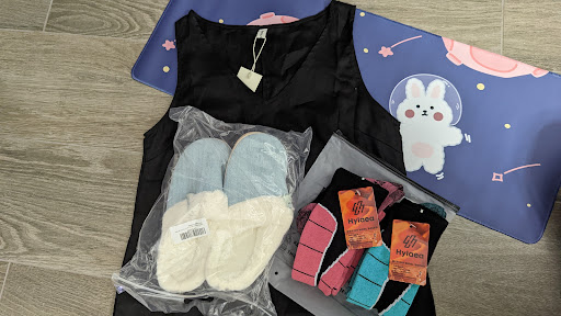 Light blue slippers - Found on Amazon for $19.99 and there were lots of these in various colors and patterns at this store to choose from. Not sure if it was a popular return or something, but they're warm and my favorite color.