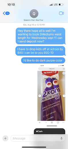 I would give her 5 stars every time she has done my hair and have been to her about 4 times but every time she has tried to give me black hair when my hair is brown. The first few times I agreed to it but this last time I booked she tried it again and I clearly told her.she wants to do what she wants to your hair instead of what I asked and agreed on. I wanted all purple hair for my birthday she stated I should’ve booked under color when I made the appointment which she made because the date I wanted was to far out so I reached out through her number on August 10th and she booked the appointment and had all text messages letting her know what I wanted. I sat in her chair after a hour wait because she was supposed to be there at 830 and showed up at 9 with no apology or explanation but my last braid appointment she was ready to cancel on me being 15 minutes late she started my hair and when I realized she was putting black in my hair I stopped her and said that’s not what I booked she then stated I would have to rebook because I didn’t hair enough hair which she told me to get 4 bundle she was nice enough to pick up the hair as my car was stolen a couple days prior which was nice of her but it wasn’t even prepped when I got there she told me I had to take accountability and then stated I was getting loud with her when I just wasn’t going to let her get over she gave me my deposit back and asked me to leave I have never had a issue with anyone that did my hair or have any problems and every time I sit in her chair it’s a problem and she blames it on the me. I was not letting her get over on me for my birthday with hair I didn’t want and she got angry for me taking up for myself. I am a braider myself and her customer service is not A1 braids are lovely but I will never book with her again. I ended up going to Royal braiding as she was going to leave me looking a hot mess as my birthday is tomorrow. I added convo pic because she blamed me and said I need to take half accountability when it clearly is her that need to. She threw it in my face that she picked up hair which is only ten minutes away and stated no one else would do that which is a lie I’m not a cheap or bummy client I’ll pay for what I want and even offered her gas and was going to tip her for everything she did for me but all I can say is she lost out on a loyal paying client just because of her attitude she clearly was making me angry then said because my voice was loud that I’m distracting people upstairs when she was yelling at me to take accountability I traveled 1 hour waking up at 530am to make it to her on bus and foot the nerve of her she also likes to compare herself to braiders and talked my ear off about people not wanting to pay her each appointment I was charged 350 my first appointment she gave extra length which I didn’t ask and still tipped her my second was 450 and today was also $450 she had nice customer service until I wouldn’t let her get over this time Then she had the audacity to text me the next morning about a bag she wanted that I had I left her ass on read and put her on block as she blocked me on all her social media sites so I wouldn’t blast her about it it wouldn’t let me update the picture but she...