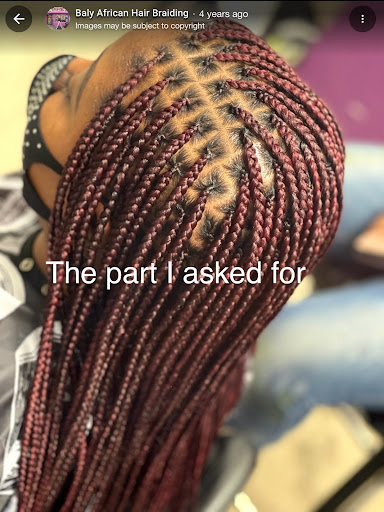 Read moreI went to Baly to get my hair braided, and the experience was okay until I started asking questions about my hair. I asked for a side part because I like my hair to be parted on the side with my braids. I felt something wasn’t right when she was braiding my hair, so I asked the stylist whether she had put in a diagonal side part or a straight side part because I wanted a straight side part. Both the stylist and the woman sitting in the chair in front of her told me it was straight. She asked me if I wanted to see a mirror, and I told her no because I was trusting the process (which was a mistake). I even showed her a picture of how I wanted my part, and she said okay. I thought I could trust my stylist, but I was wrong.