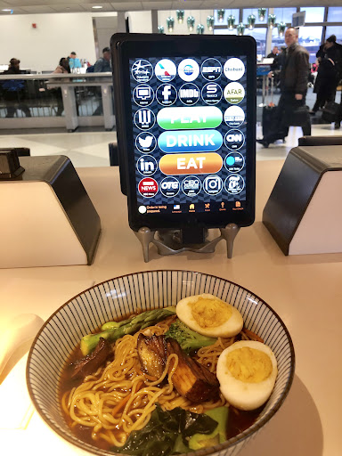 Quick, pleasant service, nice 'corner' location that gives the feel of being transported away from the airport and into nice, clean, modern restaurant. Been here a few times and I like the place.. has computer screens with menu that you have to self navigate to pick out your own food, drink or side items.. though there is a quick learning curve, once it is quickly mastered it is convenient and can pay right on the spot. The modern place is nice for travellers with good space and with plugs conveniently located on table tops.